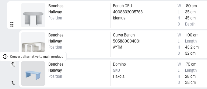 If you need to change an alternative back to a main product hover on the alternative product and click on the arrow icon. For example when you decided that one of the alternatives could actually still be in the project as a separate product.