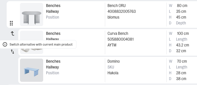 If you need to switch an alternative with the current main product hover on the alternative product and click on the two-arrowed icon. For example when a client Approves one of the alternatives instead of the main product you can easily switch them around.