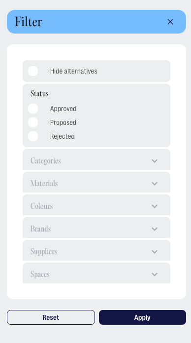 thesheet's filtering system helps you organise and view your projects more efficiently. Whether you're managing a large project or preparing to export your spec sheet, filters let you focus on exactly what you need.