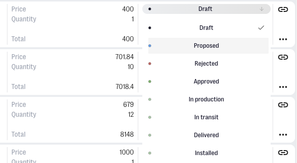 - Select Proposed (or higher). Only products in proposed, approved, rejected or ordered statuses will be visible to the client.