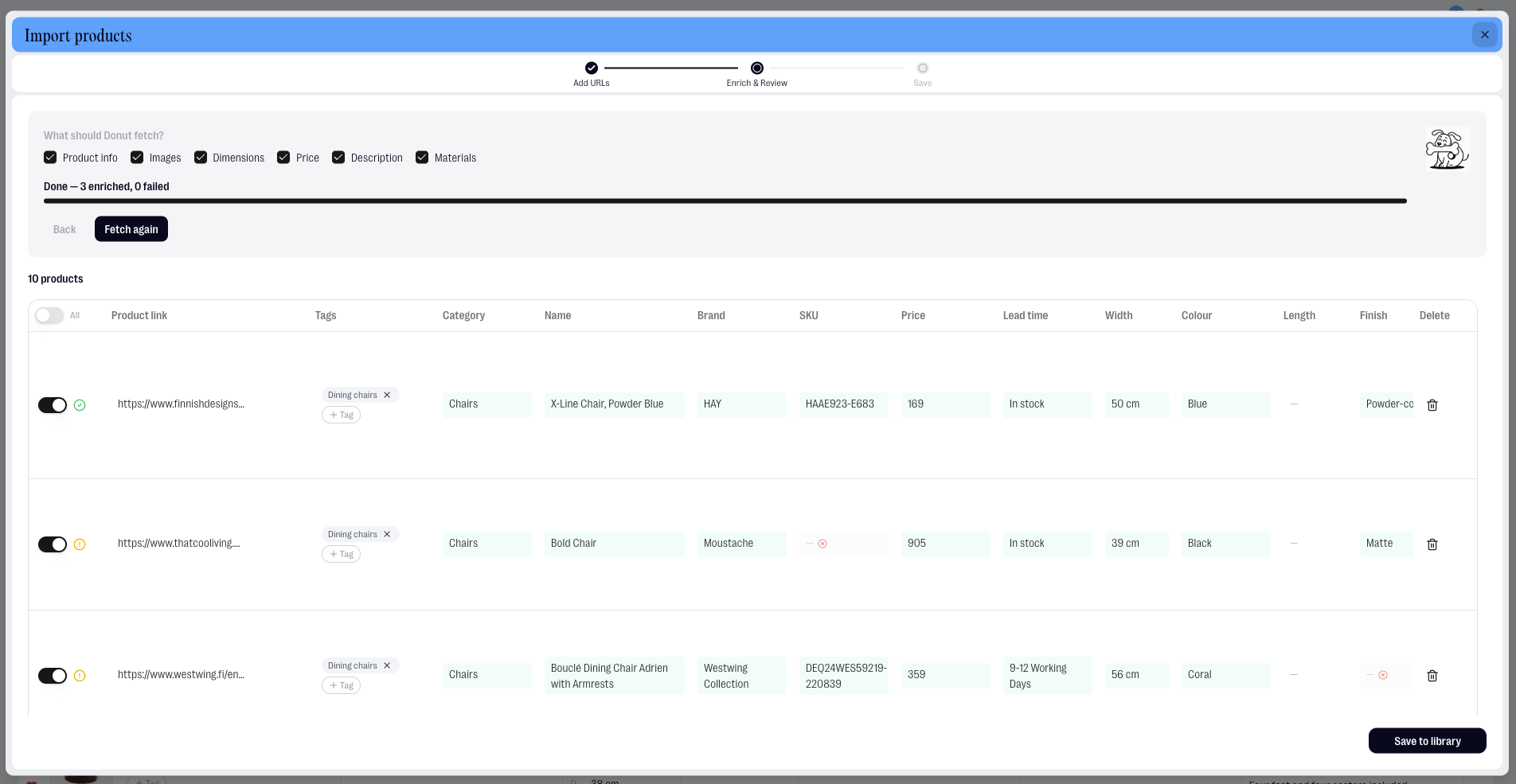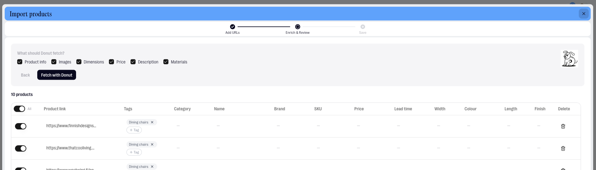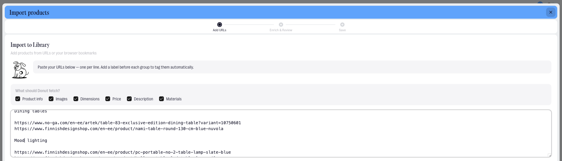 Paste in your URLs — one per line. You can also add a label to each URL (like "Cool chairs" or "Mood lighting") and it will automatically become a Tag in your library. Then choose what you want Donut to fetch for each product: