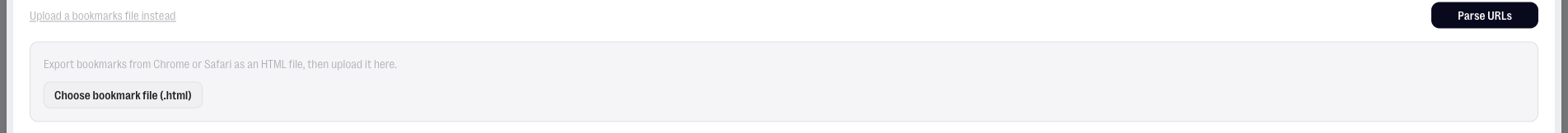 Alternatively, if you have organised browser bookmarks, you can upload a bookmarks file instead of pasting URLs manually. Export it from your browser as an HTML file and upload it directly.