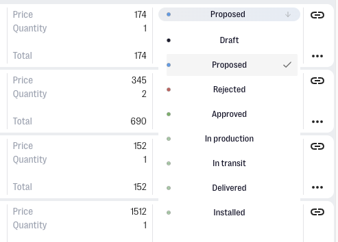 - Proposed: The first status visible to clients. Once a product is finalised, you can set it to proposed, allowing the client to review, comment, and either approve or reject the product.