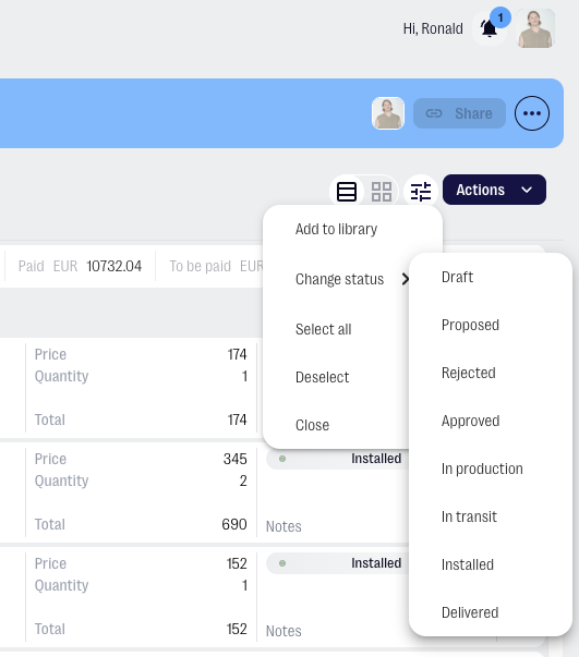 - Select the relevant status: Draft, Proposed, Approved, Rejected, or Ordered.