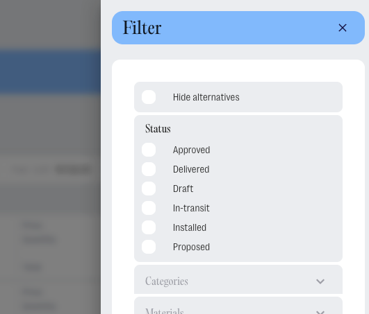 You can filter products by status to keep your project easy to navigate at every stage. As projects grow and include hundreds of items, filtering helps you quickly focus on what matters—like viewing only products that haven’t been approved or rejected yet. This makes it simple to see what still needs attention and keep things moving without getting lost in the details.