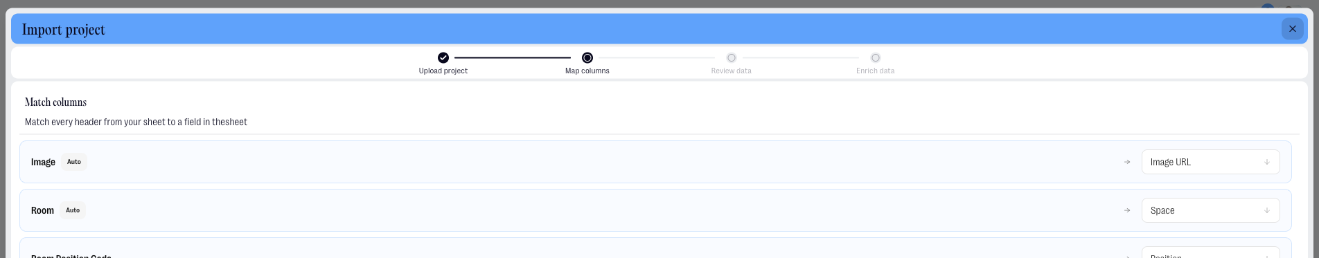 Match your spreadsheet columns to thesheet's fields. For example, "Categories" → Category, "Manufacturer" → Brand, "Room" → Spaces.