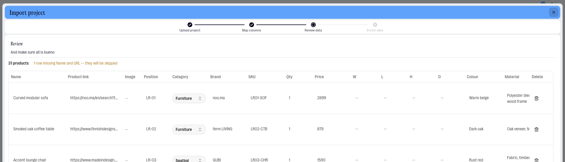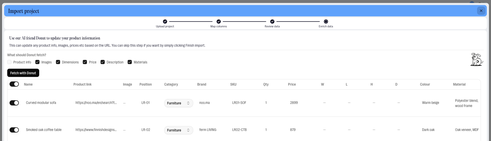 If your products have URLs, our AI-helper Donut can fetch the latest product information — images, dimensions, pricing, and other details — directly from the source. This is optional. Products without URLs simply skip this step.