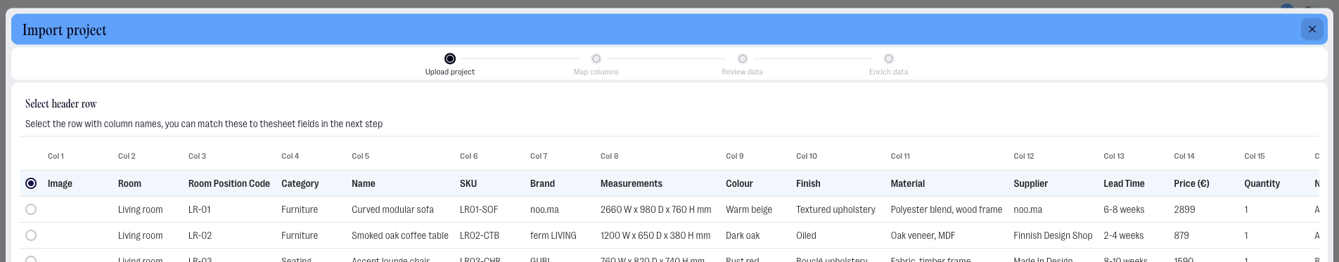 If you're moving an ongoing project into thesheet from a spreadsheet, you can import it directly from an XLSX file. The importer will walk you through all the steps including matching your existing columns to the right fields so your products land correctly.