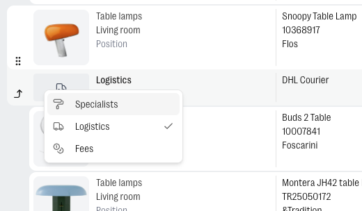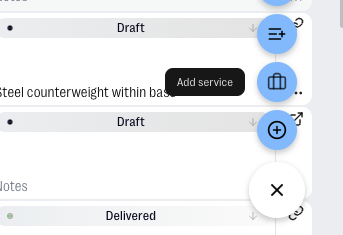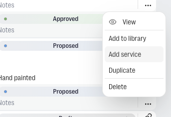 - Linked to a product — click the ··· on any product row and select Add service. The service row appears directly beneath that product, visually connected to it. Useful when a service relates specifically to one item, like a delivery charge for a particular lamp.