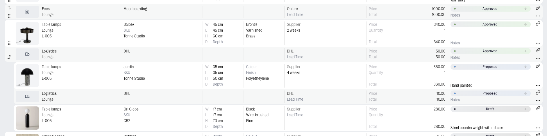 Service rows let you add service costs to your sheet alongside your products — things like contractor fees, delivery charges, or your own professional fees. They're included in the project budget total so your client sees the full picture.